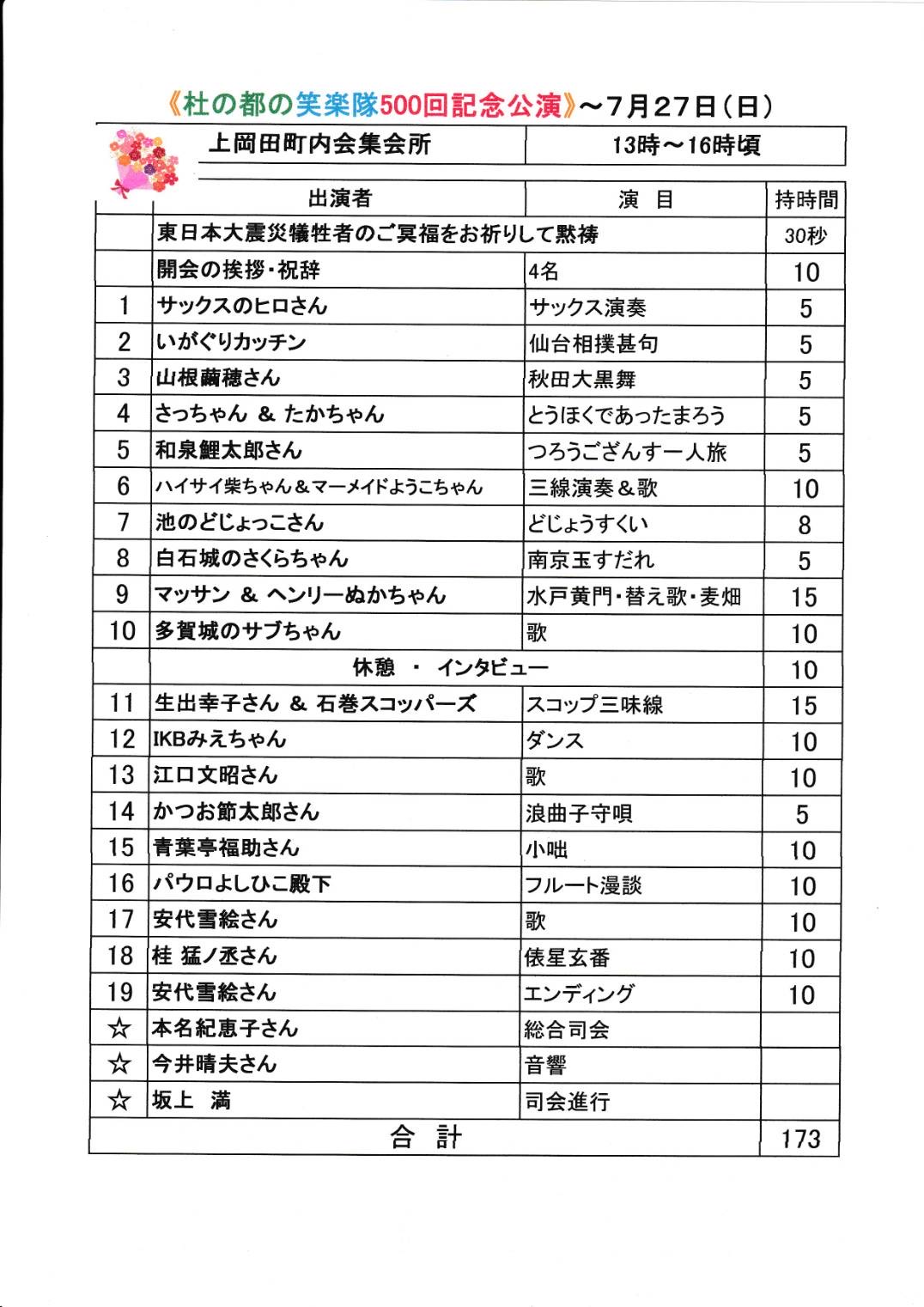 遣り甲斐を感じ、出演者も一緒に楽しんでいる」から長期に亘り継続出来ているものと思っています。