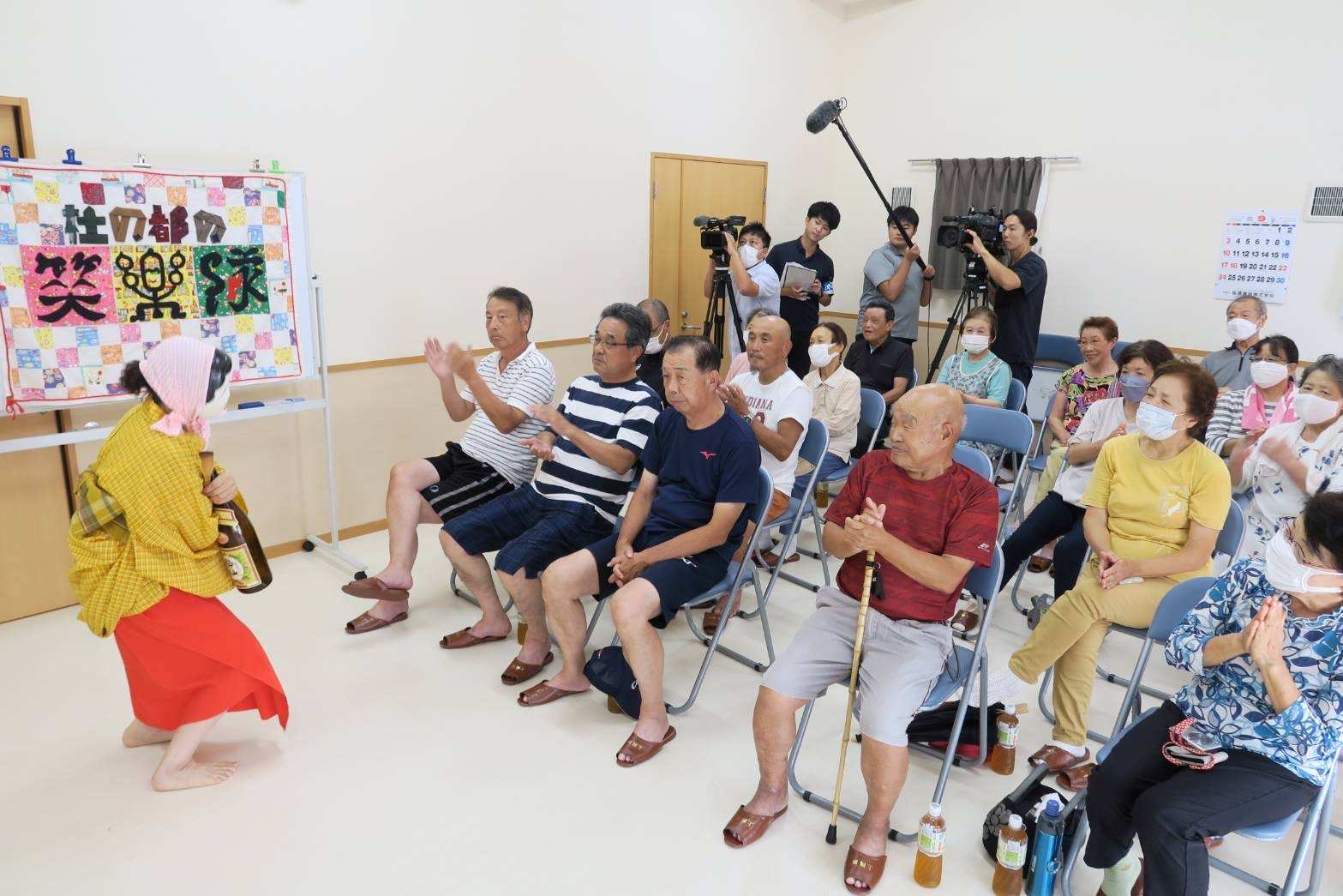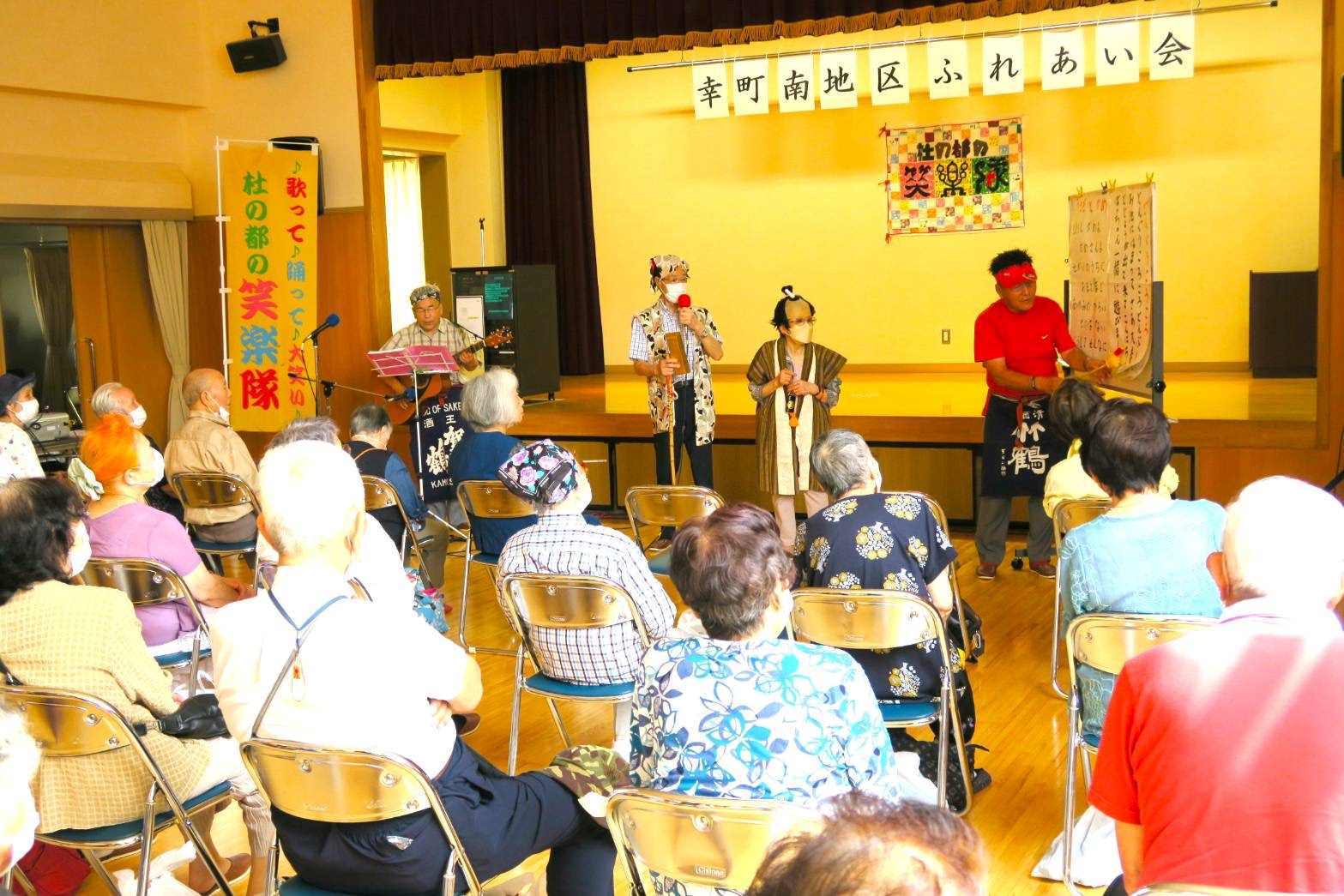 通常、酒の席では住民同士が話に夢中になりステージを見る人は少ないのだが「日本一のバラエティ笑劇団」が登場するや、