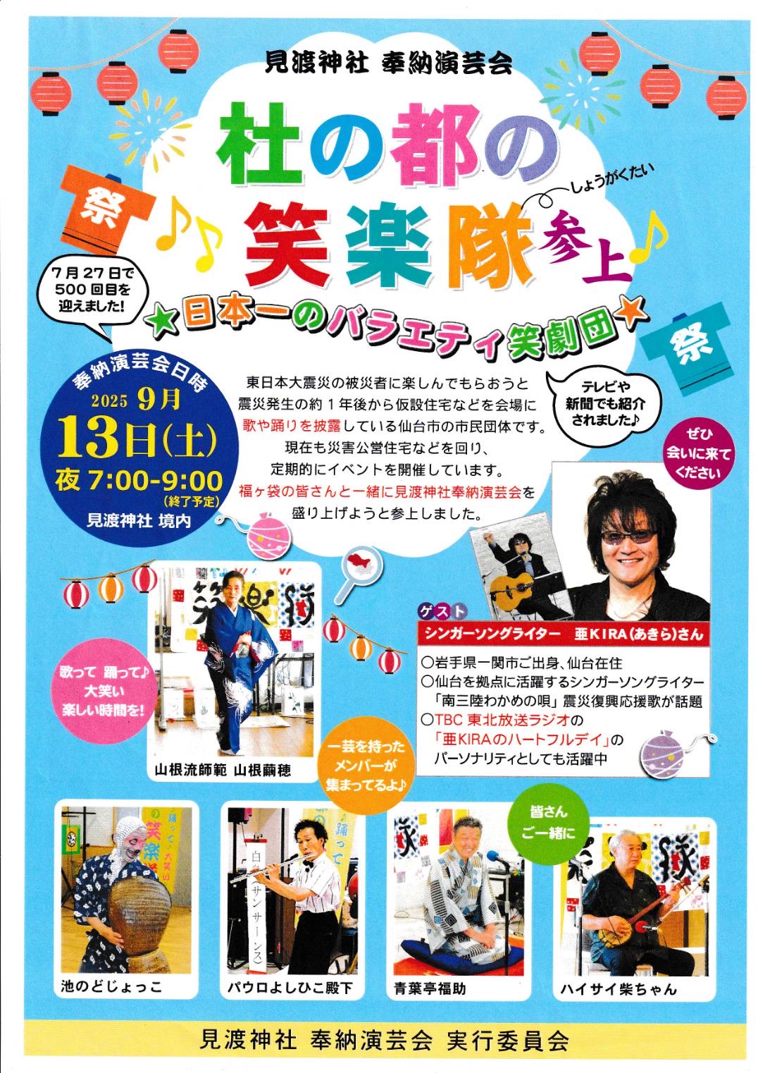 9月13日、初めての「美里町・見渡神社奉納演芸会」での公演は大好評で、地元の皆さんの大喜びして頂きました。