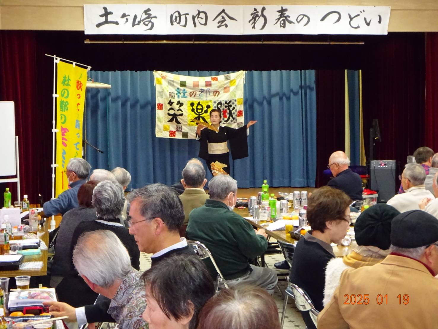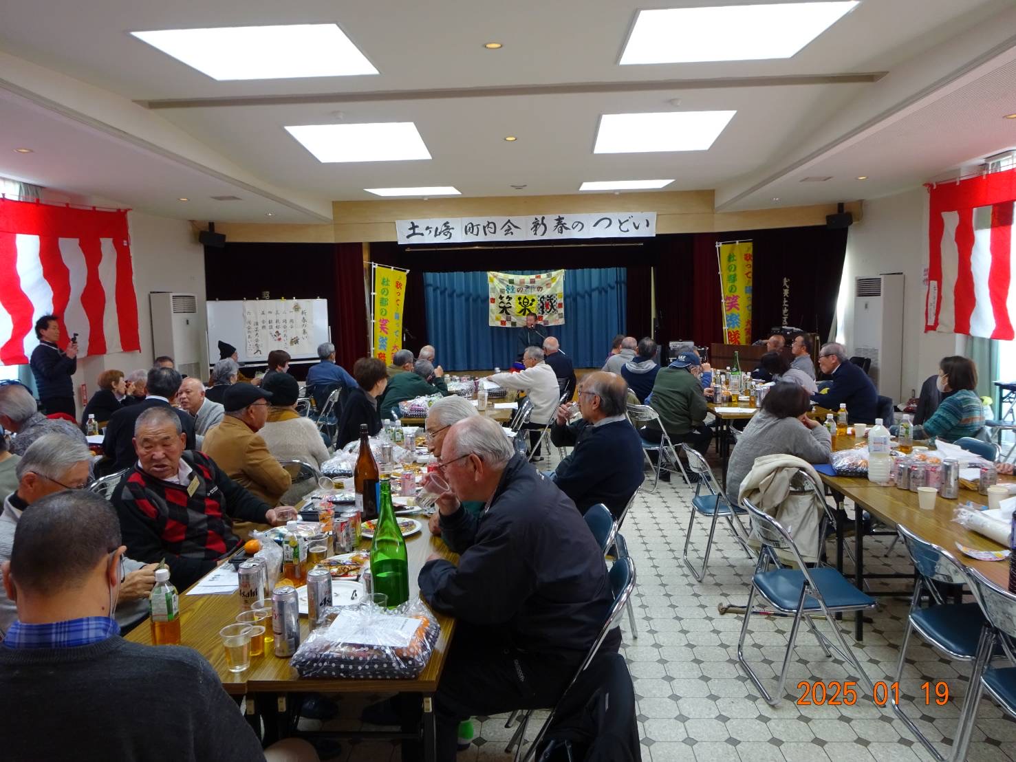 新年会らしく町内会の皆さんはご馳走とお酒で大盛り上がり!